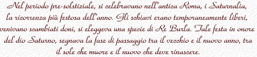 Si eleggeva persino un Episcopus puerorum o innocentium (vescovo dei fanciulli o degli innocenti) cantando un ritornello significativo, dove affiora la funzione saturnalizia che ristabilisce le condizioni anteriori all'inizio della storia umana: «Deposuit potentes de sede et exaltavit humiles (depose i potenti dal seggio ed esaltò gli umili)» (6). Ma Saturno non è soltanto il dio che presiede al rinnovamento dell'anno, che attraversa "le acque". È anche il dio che approda alla nuova riva felice, che regna sull'età dell'oro.