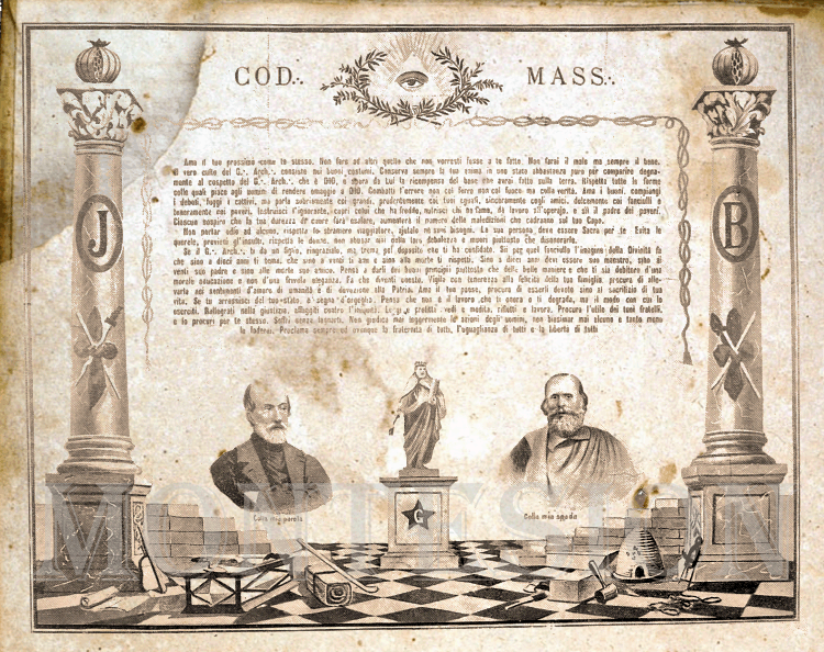 Carissimo Paolo, un Codice Massonico, non importa di quale nazione, in qualsivoglia lingua redatto, è universale, perché universale è la Massoneria. Ma come supponi esiste un “Codice Massonico” redatto in lingua Italiana e sempre dello stesso periodo ('800), "validato" addirittura da Giuseppe Garibaldi (con la mia spada) e da Giuseppe Mazzini (con la mia parola); ma, come constaterai, contiene gli stessi principi e a volte le stesse frasi. Per una tua verifica, ti consegno l’immagine del documento originale e la sua trascrizione. Grazie per gli apprezzamenti.