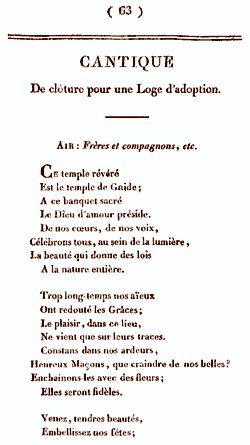 Troppo lungamente i nostri avi Hanno ridotta le Grazie; Il piacere, in questo luogo, Non viene che sulle loro tracce. Costanti nei nostri ardori, Massoni, cosa temere dalle nostre belle? Incateniamole con dei fiori; Esse saranno fedeli.