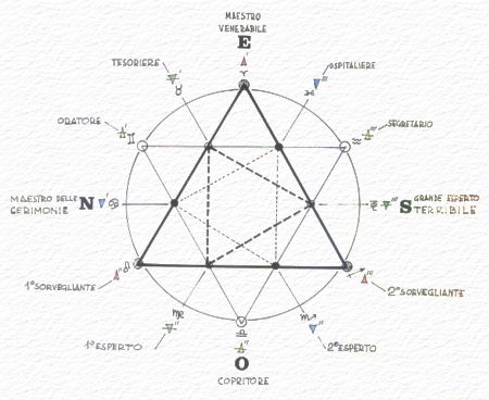 2.2 La collocazione fisica dei Fratelli in Loggia assume simbolicamente gli attributi espressi dai 12 segni zodiacali, mentre la collocazione interiore (ovvero la qualità da estrinsecare) è rappresentata dalla triplicità elementale.