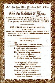 Quantunque si fossero consultate diverse fonti, non avevamo mai trovato una canzone massonica in lingua italiana (eccettuate alcune traduzioni di inni inglesi, adattate sulla musica originale). Abbiamo scoperto, di recente, una canzone nella nostra lingua a p. 207 del lavoro di Bazot "Morale della Franco-Massoneria",