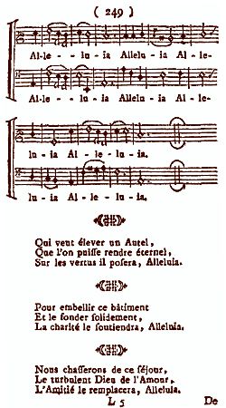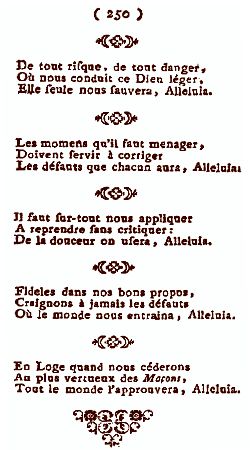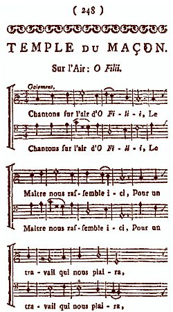 Testo di Naudot Oh filii e filiae Il maestro vi ha riunito per un lavoro che vi piacerà, Alleluia ... Facciamo un tempio all'eterno, I nostri cuori serviranno da altare, La carità lo sosterrà, Alleluia. ... Per abbellire questo Edificio, E fondarlo solidamente, Sulle virtù porrà, Alleluia. ... I momenti che si deve impiegare, Devono servire a correggere I difetti che ognuno avrà, Alleluia. ... Guardiamoci bene da ricadere Nei vizi, e pregiudizi Dove il mondo ci trascinò, Alleluia. |