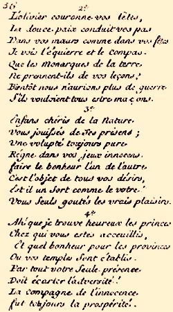 2 L'olivo incorona le vostre teste, La dolce pace guida i vostri passi, Nei vostri costumi come nelle vostre feste Vedo la squadra ed il compasso. Che i monarchi della terra Prendano delle vostre lezioni; Presto non avremmo più guerra, Se essi volessero tutti essere Massoni. 3 Figli cari della Natura, Godete dei suoi doni; Una voluttà sempre pura Regna nei vostri giochi innocenti. Fare la felicità uno dell'altro, È l'oggetto di tutti i vostri desideri, È una sorte come la vostra? Voi solo assaggiate i veri piaceri.