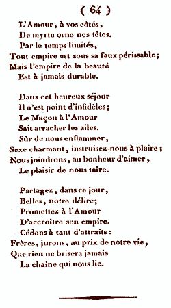 Troppo lungamente i nostri avi Hanno ridotta le Grazie; Il piacere, in questo luogo, Non viene che sulle loro tracce. Costanti nei nostri ardori, Massoni, cosa temere dalle nostre belle? Incateniamole con dei fiori; Esse saranno fedeli.