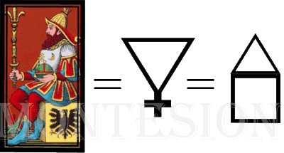 Il geroglifico del segno del Sagittario; come abbiamo detto, è una freccia la cui inclinazione sta ad indicare la partenza da un centro inferiore, per colpire un bersaglio posto in alto. In tale ideogramma possiamo notare, oltre alla freccia, anche una croce ( nella punta della freccia un 'triangolo' ( Del resto, anche in alchimia troviamo lo stesso simbolo Nelle carte dei Tarocchi troviamo una bella espressione di questo simbolo nell'Arcano Maggiore n. 4, l'Imperatore, avente una gamba incrociata all'altra e poggiante su di un cubo (la materia): In lingua sanscrita troviamo che il segno del Sagittario è detto DHANUS.