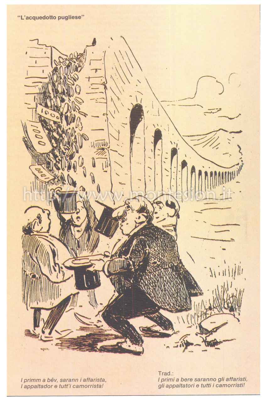 Nonostante le prime analisi e iniziative politiche sulla questione meridionale datassero agli inizi degli anni settanta, cioè dopo la pubblicazione delle Prime Lettere Meridionali di Pasquale Villari, il governo Zanardelli fu il primo a prendere seriamente in esame la complessa problematica e ad abbozzare delle soluzioni, per quanto parziali e inefficaci. Tra i provvedimenti di maggior spicco figura il progetto per la realizzazione dell’acquedotto pugliese, che dopo un lungo e tormentato iter parlamentare fu tradotto in legge nel marzo 1901. Esso prevedeva la costituzione di un consorzio tra lo Stato (che aveva considerato uno stanziamento di oltre 100 milioni in 25 anni) e le province pugliesi (che avrebbero partecipato complessivamente con altri 25 milioni) per la costruzione e l’esercizio di un acquedotto giudicato all’epoca ambizioso e imponente. Progettato nelle sue linee essenziali fin dal 1868, avrebbe dovuto trasferire in Puglia le acque del Sele attraverso un percorso di circa 240 chilometri e distribuirle nei centri delle province di Bari, Lecce e Foggia. La completa esecuzione dei lavori era prevista entro l’agosto 1916, ma essi furono proseguiti ancora per diversi anni; alla fine del 1927, dopo cinque anni di reale attività, l’acquedotto serviva un centinaio di comuni. Tra i maggiori intralci alla corretta e rapida esecuzione dell’acquedotto fu l’errore governativo di affidare gli appalti, decisamente appetitosi, a imprenditori settentrionali per i quali il Sud rappresentava esclusivamente una terra di conquista e il pretesto per lucrosi quanto loschi affari: come, in effetti, volevano dimostrare gli autori di questa vignetta de ‘L’uomo di pietra’. "L’uomo di pietra", 14 giugno 1902