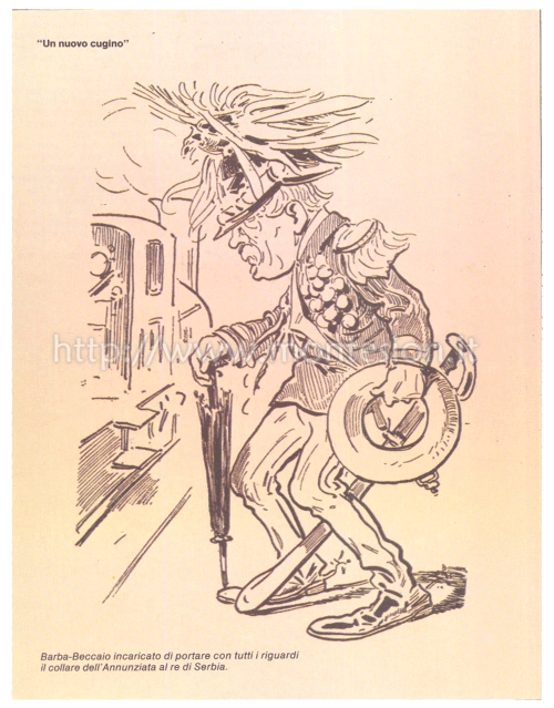 Il generale Bava Beccaris, soprannominato dall’opinione pubblica Barba-Beccaio per la durezza con cui aveva represso nel sangue i moti popolari di Milano nel 1898, fu un bersaglio costante della satira scritta e disegnata dell’epoca. Certamente egli fu, tra i personaggi pubblici, il meno amato dai suoi contemporanei, che non gli perdonavano la troppo rigida e schematica interpretazione delle proprie funzioni di militare. L’occasione che generò questa vignetta fu l’ascesa al trono di Serbia del re Pietro Karadordevid, avvenuta in circostanze degne di un feuilleton truculento. Fino a poche settimane prima, in effetti, sul trono era seduto Alessandro Obrenovic, che lo aveva ereditato nel 1889 e lo esercitava in maniera dispotica ricorrendo spesso e volentieri a sistemi repressivi. Era una situazione insostenibile a gran parte dell’esercito, che nella notte tra il 10 e l’11 giugno 1903 si sbarazzò, per mano di un gruppo di congiurati, dello scomodo sovrano, dei suoi familiari e di molti ministri con una strage che destò vivo scalpore. II 15 giugno Pietro Karadordevic ottenne la corona regale e subito l’opinione pubblica lo indicò come il sanguinario ideatore dello sterminio essendone stato il beneficiario. A sanguinario, sanguinario e mezzo: il governo italiano incaricò proprio Bava Beccaris di recarsi in Serbia per conferire al nuovo re il collare dell’Annunziata. Da qui la facile ironia dei giornali dell’epoca, che riferirono di questo viaggio del generale italiano come di una visita di cortesia tra professionisti della violenza. "L’uomo di pietra", 4 luglio 1903